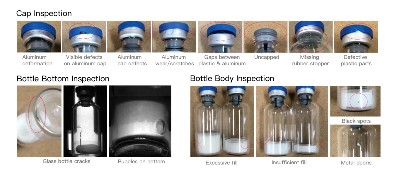· Vial bottom inspection – Detects cracks, foreign objects, and contamination at the base.